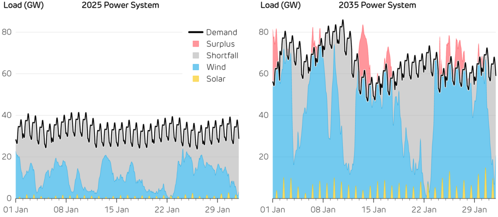 The mismatch between demand for electricity and supply from weather-driven renewables during January 2025 (left), and simulated for the power system in 2035 (right). The the red and grey shaded areas show demand net of renewables, which is a core metric that determines how much flexibility is required to ‘top up’ wind and solar or reduce demand to keep the lights on – the higher the value, the more flexible the system needs to be.