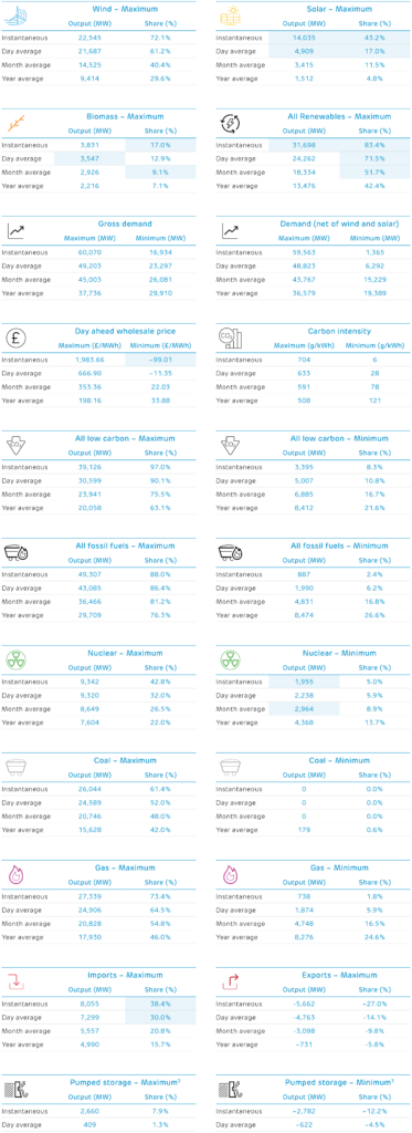 The tables below look over the past sixteen years (since 2009) and report the record output and share of electricity generation, plus sustained averages over a day, a month, and a calendar year. Cells highlighted in blue are records that were broken in the third quarter of 2025. Each number links to the date it occurred on the Electric Insights website, so these records can be explored visually.