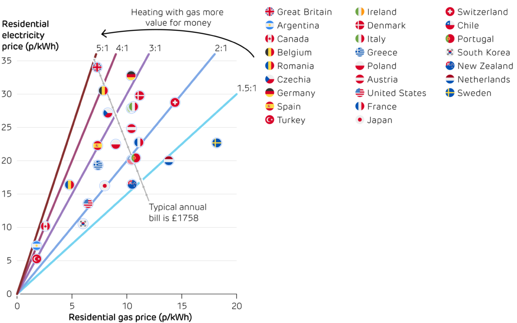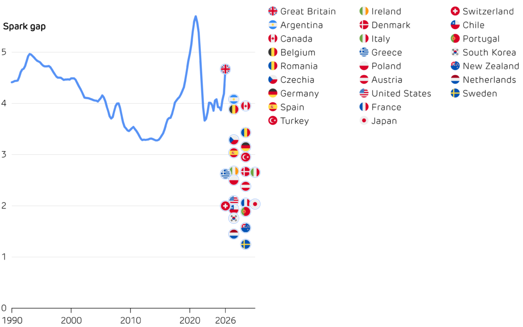 Ever since Britain has had an electricity market, its spark gap has ranged from around 3.5 to 5 – always at the top end of the 25 major countries compared below. Two factors drive this: gas is relatively cheap for British households, and electricity is relatively expensive.